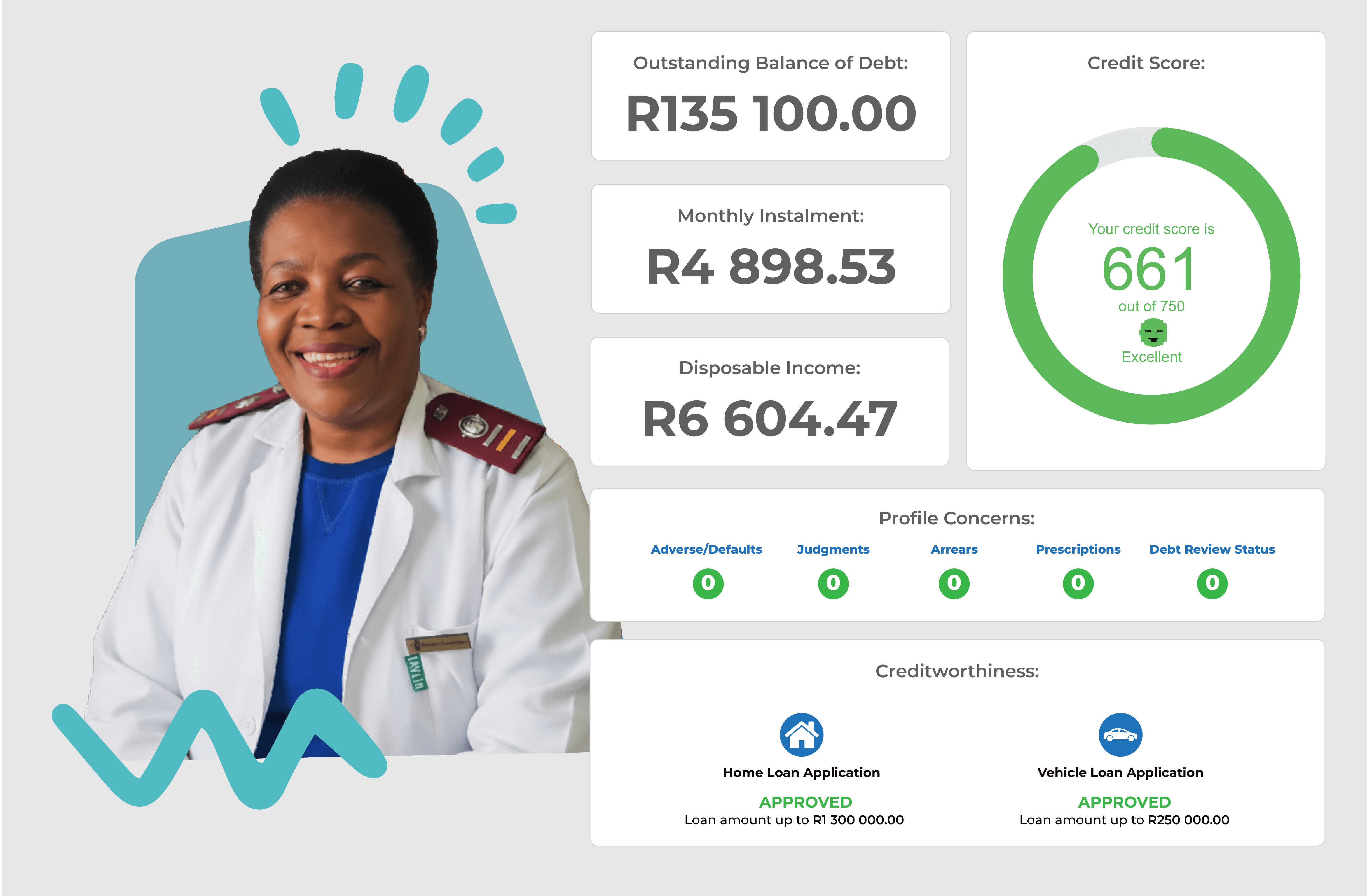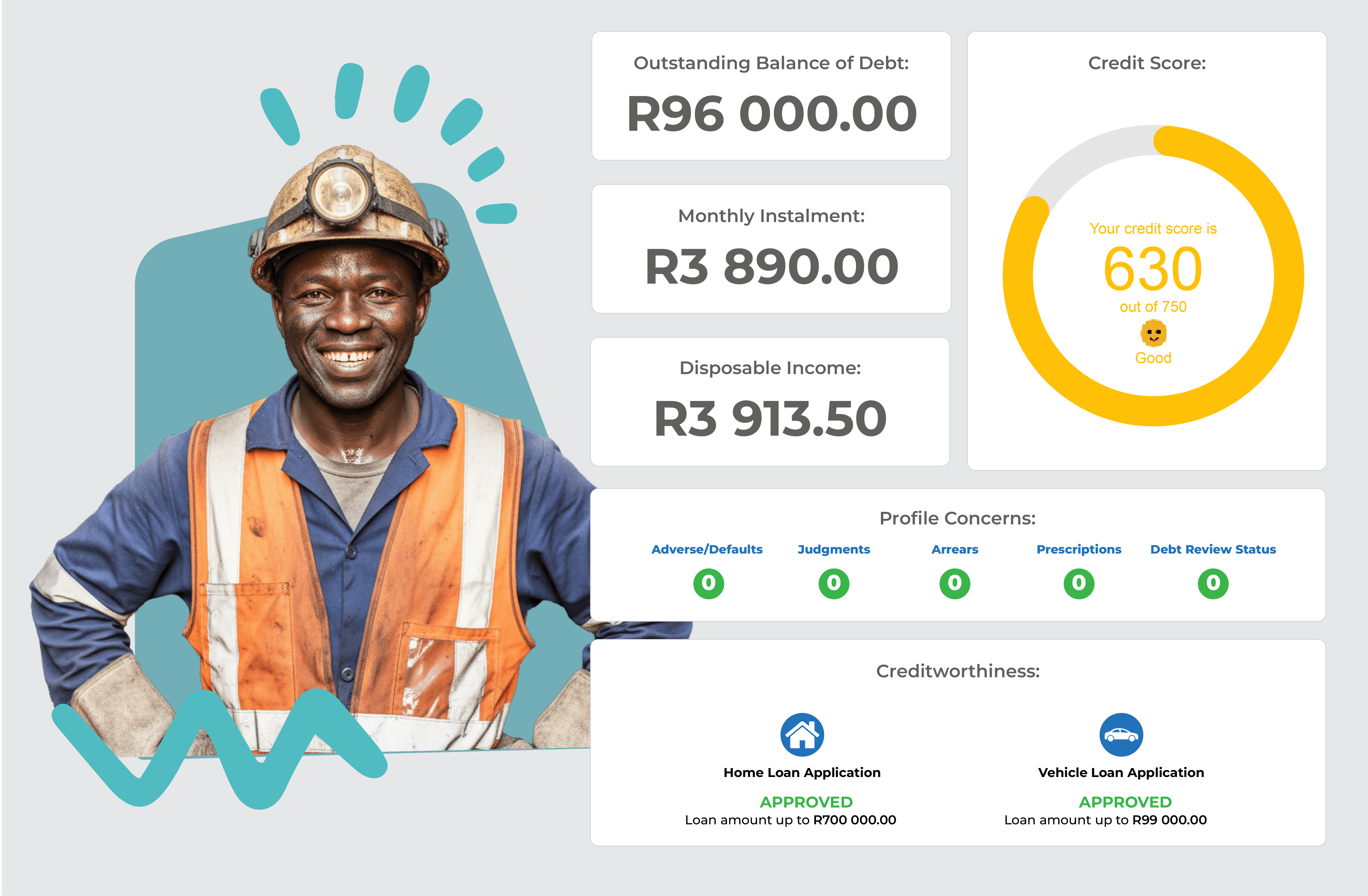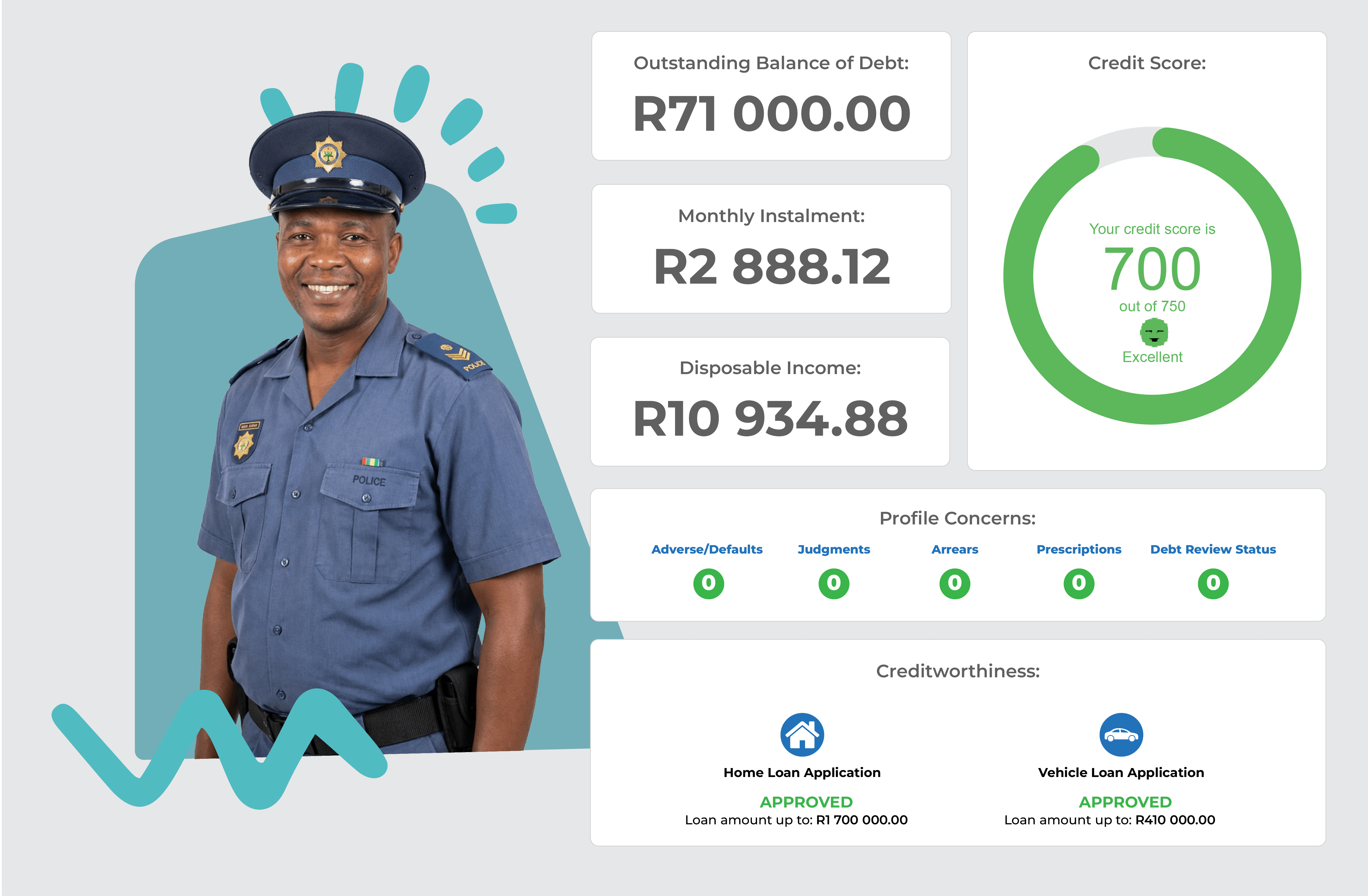 As part of our solution, we provide you with an in-depth comprehensive view of your personal financial situation. This includes an overview of your credit score and report and your debt history. When registering on the platform, we retrieve your credit information from a credit bureau to show you this picture on your dashboard. For that, we will need your ID number.